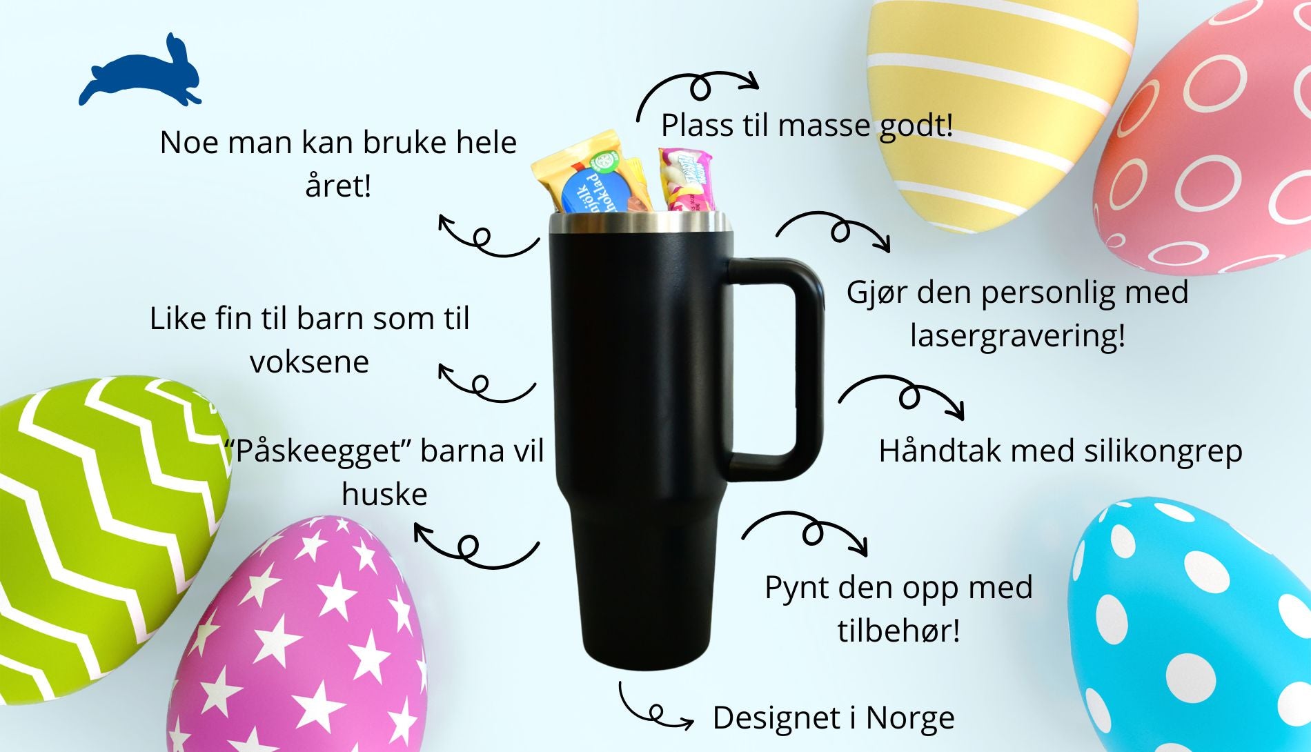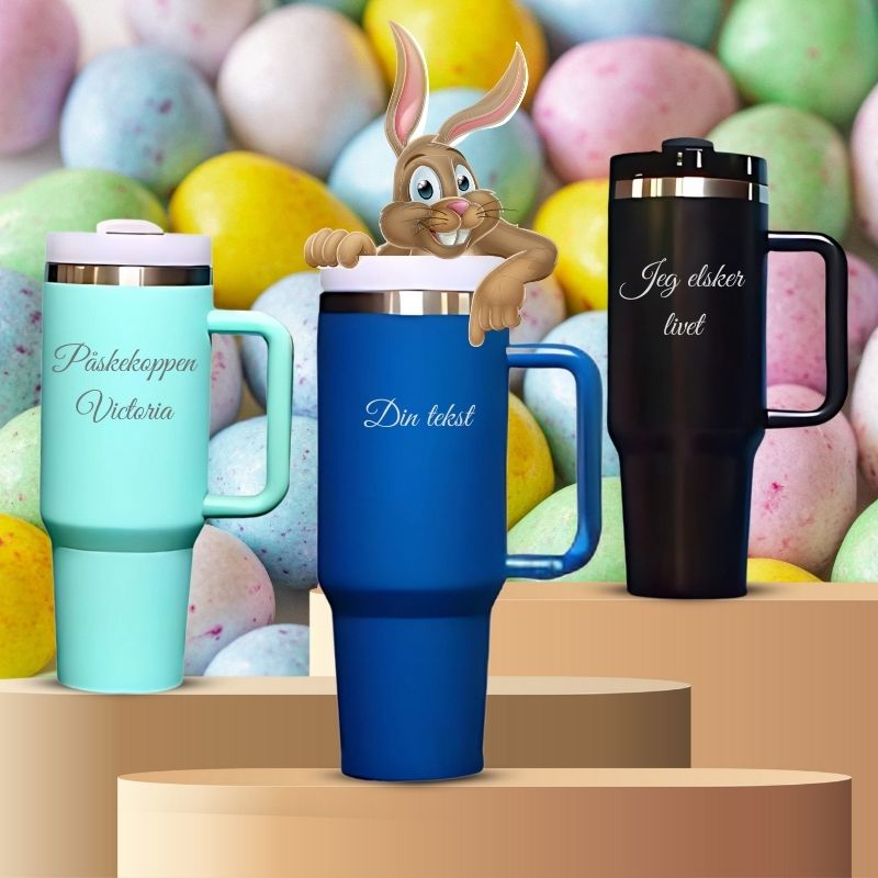 Påskeegg fylt med godteri er den klassiske påsken. Hva med å prøve noe helt nytt, som en av våre termokopper fylt opp med det man ønsker av sjokolade , godteri eller helt andre ting. For å gjøre den helt personlig, så kan den bestilles med ønsket tekst som lasergraveres. En påskegave som virkelig skaper minner, og som kan brukes hele året. Perfekt til både store og små.