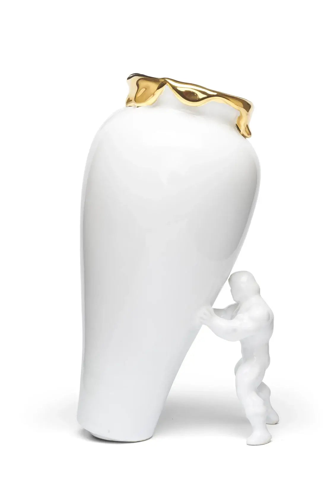 Den håndlagde vasen i hvitt og 24 karat gullglans kombinerer tidløs skjønnhet med en sterk symbolikk. Superhelten som støtter den, representerer mot og utholdenhet