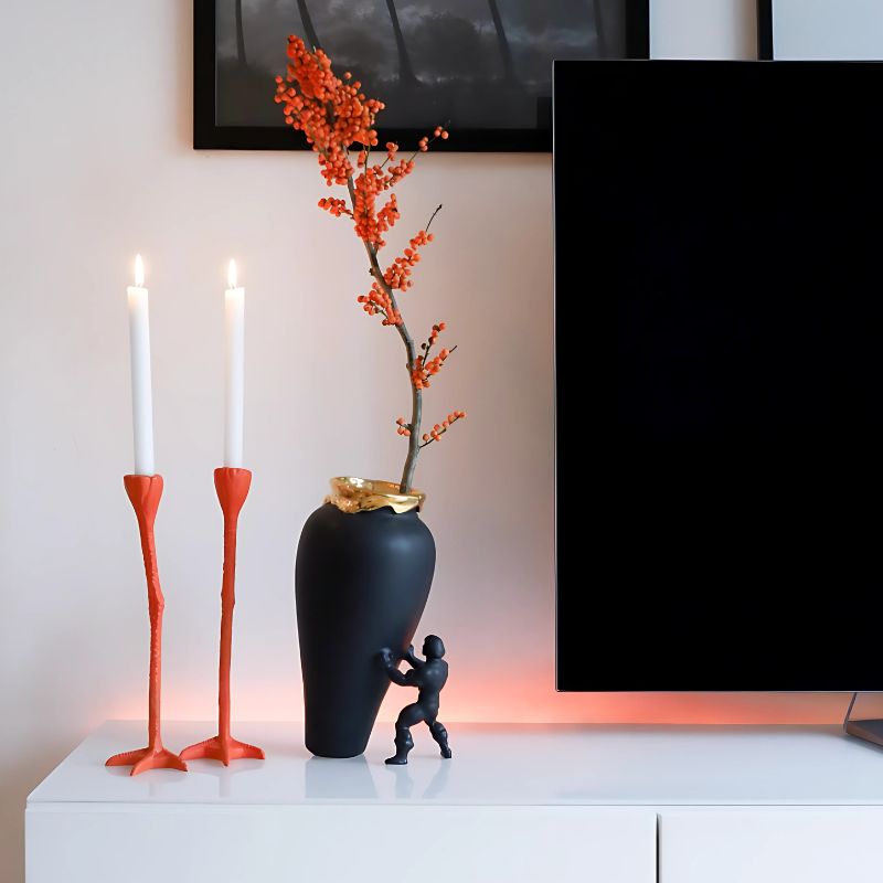 Ved første øyekast kan det se ut som vasen er på vei til å velte, men den blir støttet opp av en superhelt som står klar til å redde dagen. Dette lekne, men samtidig kraftfulle designet, gir vasen en unik karakter og en dypere mening – en påminnelse om at styrke kan komme fra de mest uventede steder.
